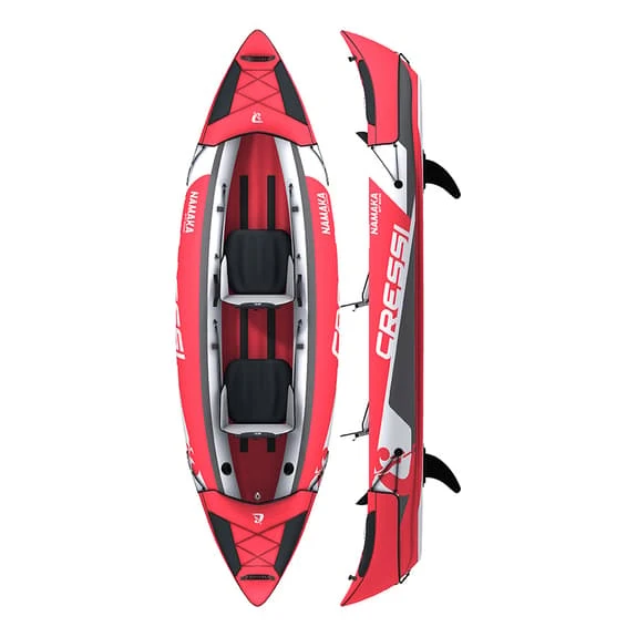 The Cressi Namaka 10’7″ kayak is an inflatable kayak with fantastic stability thanks to its tubular section air chambers designed to withstand waves. Your comfort is guaranteed by the inflatable seats that provide an elevated paddling position, while the Velcro straps and adjustable straps allow you to move and adapt the lumbar support throughout the cockpit. The Namaka is equipped with nylon lining at the bow and stern as splash guards, practical bungee cords, handles for easy carrying, velcro paddle holder and reinforced height with anti-abrasion coating. This set is ready with all the necessary accessories for inflation, from the pump to the oars, to the quick-attach keels. The 1000 denier multi-layer hermetic weave material of which it is made gives it an optimum stiffness/weight ratio. It also has tubular air chambers with independent valves on the sides and also on the bottom, with specific anti-abrasion reinforcement.