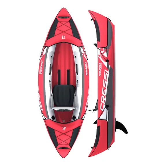 The Cressi Namaka 8’22” kayak is an inflatable kayak with fantastic stability thanks to its tubular section air chambers designed to withstand waves. Your comfort is guaranteed by the inflatable seats that provide an elevated paddling position, while the Velcro straps and adjustable straps allow you to move and adapt the lumbar support throughout the cockpit. The Namaka is equipped with nylon lining at the bow and stern as splash guards, practical bungee cords, handles for easy carrying, velcro paddle holder and reinforced height with anti-abrasion coating.