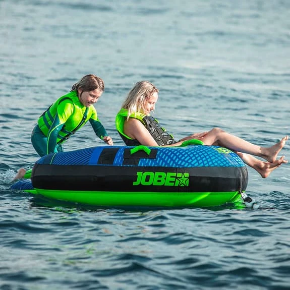 The Jobe Ridge Towable 2-person water towable is the most accessible and affordable. Jobe’s Ridge is constructed of tough, durable 840D nylon and a 24-gauge PVC bladder and is equipped with an easy one-way boston valve and a quick-lace connector.