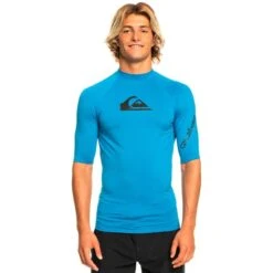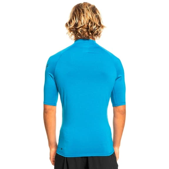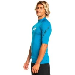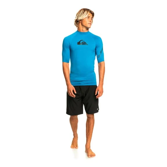 The Quiksilver Surf All Time Short-Sleeved T-Shirt offers comfort and freedom of movement. It is made of soft and breathable recycled polyester. The fabric is chlorine-resistant and UV-protected. It has distinctive stylish urban brand details. A t-shirt for surfing.