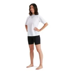 The Speedo Women’s Short Sleeve Swim Tee is a women’s swim shirt from the Essentials range. It covers you and you can wear it outdoors or in the pool. Offering UPF40+ sun protection and a comfortable, relaxed fit, it is ideal for active beach days spent in and out of the water. ECO EnduraBrite fabric offers excellent color performance, so you can enjoy black color for longer. Offering greater chlorine resistance than standard swimwear fabrics, the swim shirt stays looking newer for longer and is made from 100% recycled materials, so it’s also better for the environment.